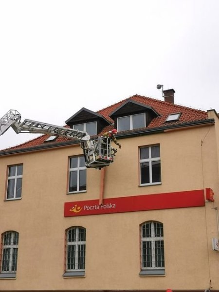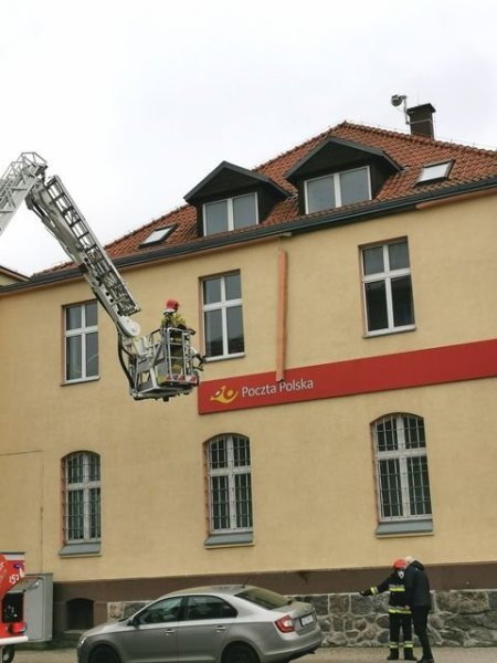 W poniedziałek, 15 marca strażacy zostali wezwani do usunięcia zwisającego gzymsu z budynku poczty przy ulicy Polskiej w Szczytnie.