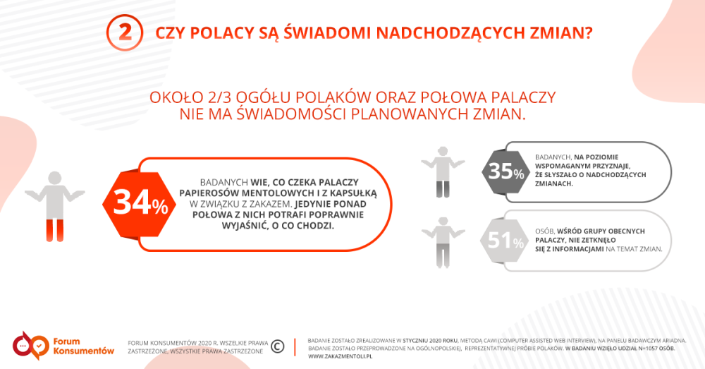 W badaniu zrealizowanym na zlecenie Forum Konsumentów w styczniu 2020 r. na reprezentatywnej próbie Polaków, firma badawcza Maison&Parners ustaliła, że mało kto wie o nowych przepisach i planowanych zmianach, a sami palacze nie rozumieją czemu ma służyć pozbawianie ich wyboru.