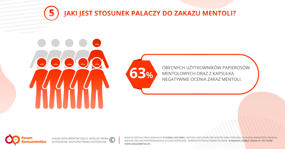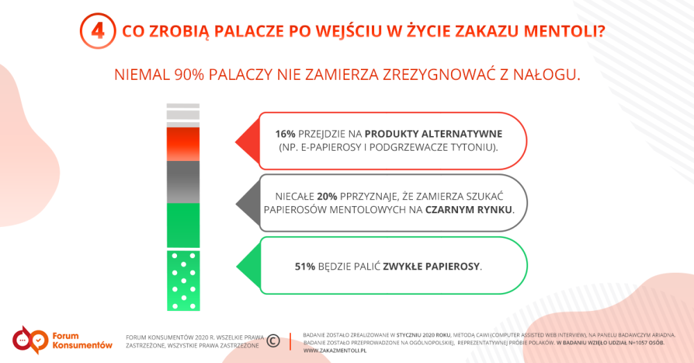 51 proc. palących papierosy mentolowe odpowiedziało, że po wprowadzeniu zakazu przerzucą się na inne papierosy, 20 proc. będzie kupowało dalej mentolowe, ale na czarnym rynku z nielegalnych, często niebezpiecznych źródeł, 16 proc. wybierze produkty alternatywne o mentolowym aromacie jak e-papierosy lub podgrzewacze tytoniu, które w 2017 roku wprowadzono do Polski pod nazwą IQOS, a 2 proc. będzie samodzielnie sobie przygotowywać papierosy smakowe. Te opinie potwierdzają przypuszczenie, że zakaz nie zmniejszy radykalnie liczby palących.