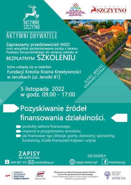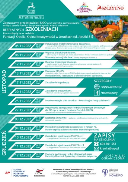 W Jerutkach rusza cykl bezpłatnych szkoleń przeznaczonych dla organizacji pozarządowych oraz grup nieformalnych działających na terenie naszego powiatu (Koła Gospodyń Wiejskich Ochotnicze Straże Pożarne, kluby sportowe, fundacje, itp.). Pierwsze szkolenie pt. „Pozyskiwanie źródeł finansowania działalności” już w najbliższy weekend 5-6 listopada. Miejsce – Siedziba Fundacji Kreolii w Jerutkach. Zapisy chętnych przyjmowane są pod numerem telefon 604 801 551. Liczba miejsc ograniczona (grupy do 20 osób).