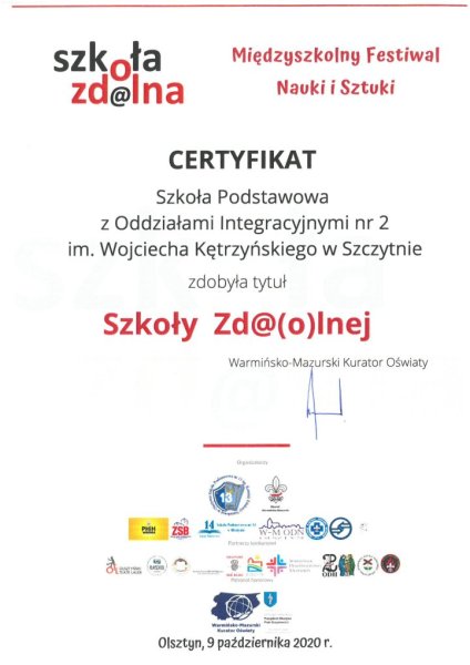 Najlepsze szkoły w ramach głównej nagrody otrzymywały certyfikat „Szkoła zda(o)lna”. Certyfikat można było uzyskać biorąc udział w co najmniej trzech zaproponowanych przez organizatorów konkursach. Społeczność szczycieńskiej szkoły wzięła udział w sumie w sześciu konkurencjach, w każdej z nich zajmując czołowe miejsca.