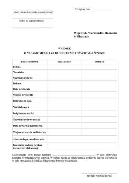 Medale mogą otrzymać pary, które zawarły ślub cywilny w latach 1975–1976. Wniosek może złożyć nie tylko para, ale również ich dzieci lub wnuki. Dodatkowe informacje można uzyskać pod numerem telefonu: 89 623 25 86.