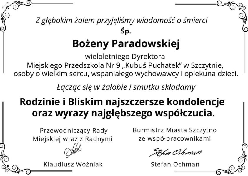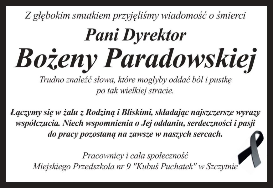 Z głębokim smutkiem przyjęliśmy wiadomość o śmierci Bożeny Paradowskiej – wieloletniej dyrektorki Przedszkola „Kubusia Puchatka” w Szczytnie. Odeszła nagle w nocy z poniedziałku na wtorek. Miała 59 lat.