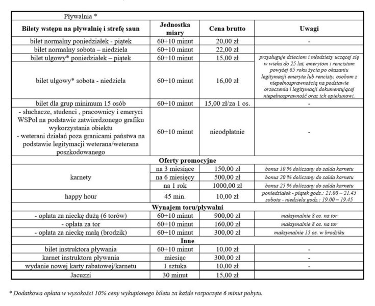 Jakie będą ceny biletów? Godzinne wejście od poniedziałku do piątku będzie kosztowało 20 zł od osoby. Bilet ulgowy (dla dzieci, młodzieży, studentów oraz emerytów powyżej 65 roku życia) - 15 zł. W sobotę i niedzielę bilety będą kosztowały odpowiednio 22 i 16 zł. Do każdej godziny będzie doliczone 10 minut na wejście i wyjście z basenu. Czas będzie mierzył elektroniczny system.