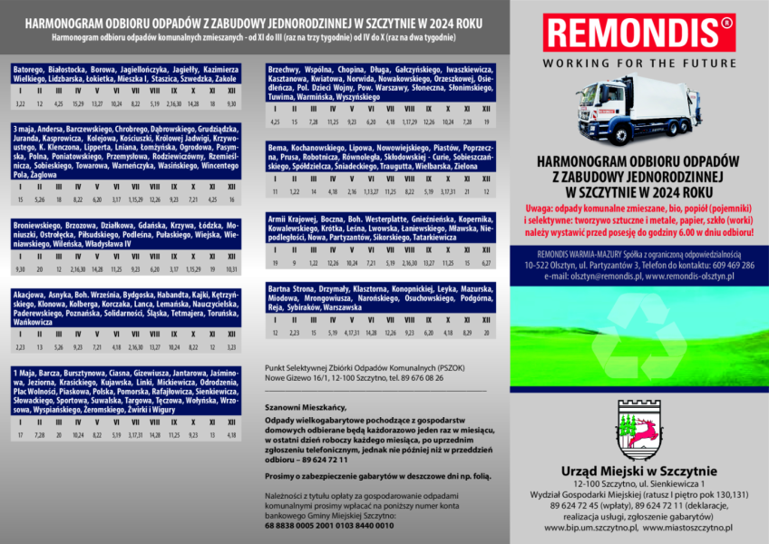 Znamy harmonogram wywozu odpadów w roku 2024 w Szczytnie.