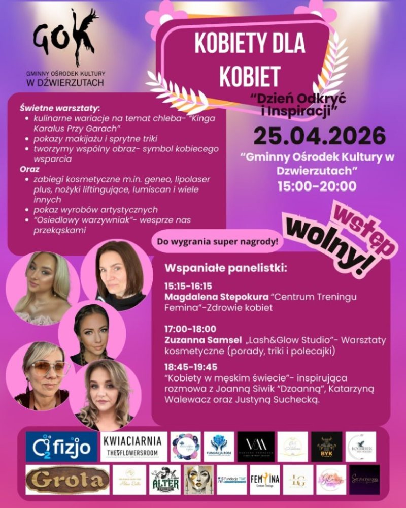 W sobotę, 25 kwietnia, w godzinach 15:00–20:00 w GOK w Dźwierzutach odbędzie się wydarzenie „Kobiety dla kobiet – Dzień Odkryć i Inspiracji”. Organizatorzy zapowiadają kilka godzin programu łączącego praktykę, rozmowę i integrację. Wstęp jest wolny.