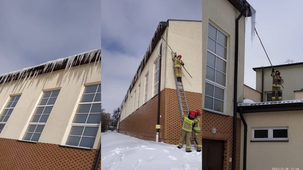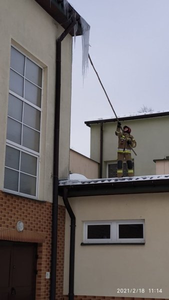 Jako przykład podaje jedną z interwencji przeprowadzonych na budynku hali sportowej Zespołu Szkół nr 3 w Szczytnie. Z dachu zwisały tam ciężkie sople i duże nawisy śnieżne. W związku z tym, że sytuacja była groźna dla osób, które przechodziły chodnikiem przylegającym do budynku ratownicy zabezpieczyli miejsce i ruszyli do usuwania zagrożenia.