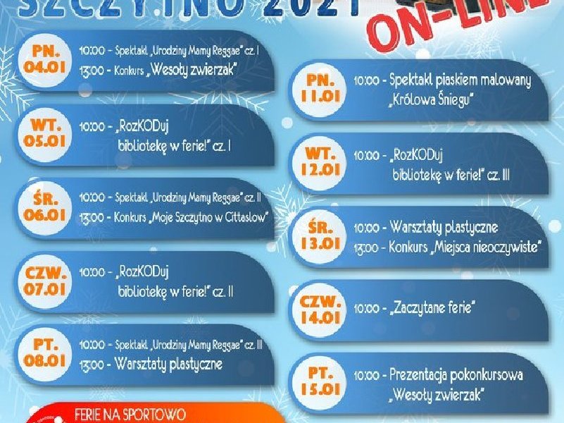 W poniedziałek, 4 stycznia rozpoczynają się zimowe ferie. Mimo pandemii w Szczytnie nie zabraknie atrakcji dla uczniów. Szczegóły na plakacie.