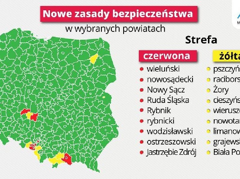 Ministerstwo Zdrowia aktualizuje na bieżąco Listę powiatów czerwonych i żółtych, biorąc pod uwagę liczbę nowych potwierdzonych przypadków koronawirusa.