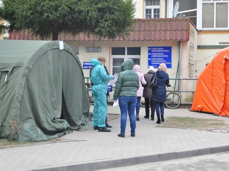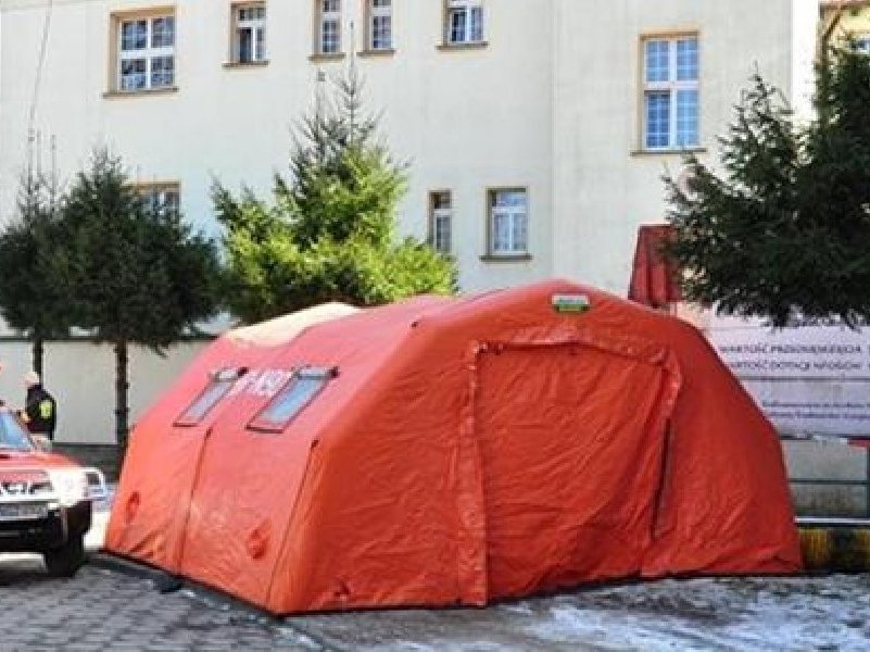 Przy szczycieńskim szpitalu stoją już dwa namioty medyczne. W tym w kolorze zielonym dokonywana jest wstępna selekcja pacjentów. Z kolei pomarańczowy przygotowany jest dla pacjentów z...