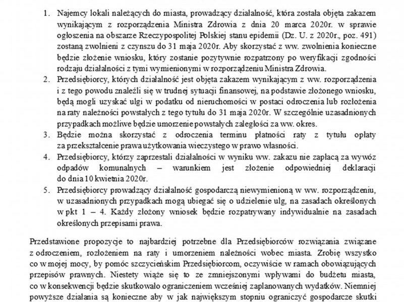 Komunikat Burmistrza Miasta Szczytno dotyczący pomocy dla przedsiębiorców.