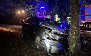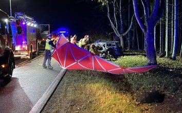 Mercedes „zaparkowany” w poprzek drogi i na drzewie. W aucie na tylnej kanapie śpiący 20-letnia kobieta i 29-letni mężczyzna. Oboje byli pijani. Policjanci sprawdzają, kto...