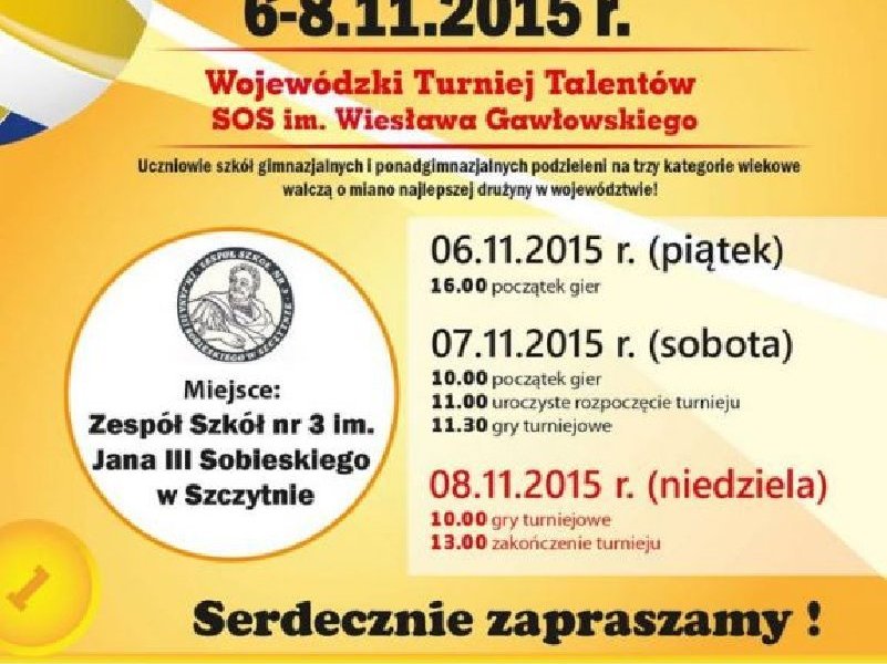Mecze rozgrywane będą w hali sportowej przy Zespole Szkół nr 3 im. Jana III Sobieskiego w Szczytnie. Impreza potrwa do niedzieli. Oto rozkład pojedynków: Piątek, 6 listopada:...